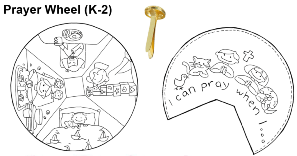 Make this prayer wheel and say a prayer every day. First say thank you to God for ……………………, then say you are sorry for…………………….. and lastly say please can you help……………………………………. Amen.